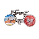 Metalowy, elegancki magnes pełniący również funkcję otwieracza, w kształcie rowerka z koszykiem, którego rama ozdobiona jest napisem Polska. Koła roweru wypełnione są kolorowymi, fakturowanymi naklejkami o tłoczonej, przyjemnej w dotyku powierzchni, mieniącej się metalicznie w świetle. Tylne koło przedstawia orła w koronie na biało-czerwonym tle utworzonym z napisów Polska.
