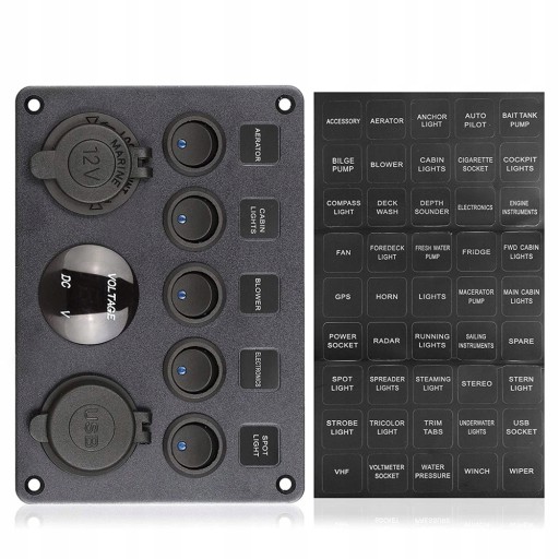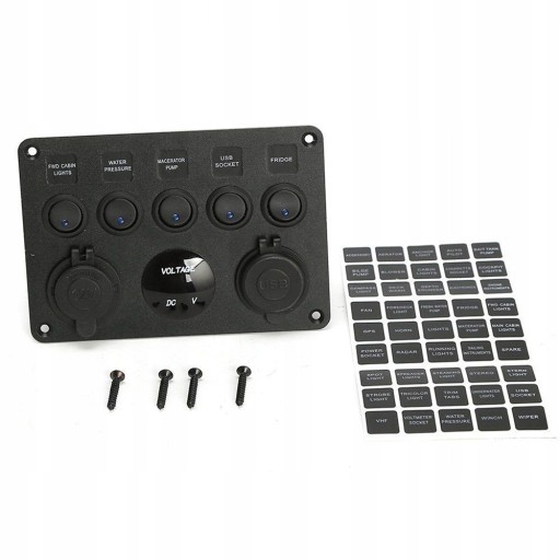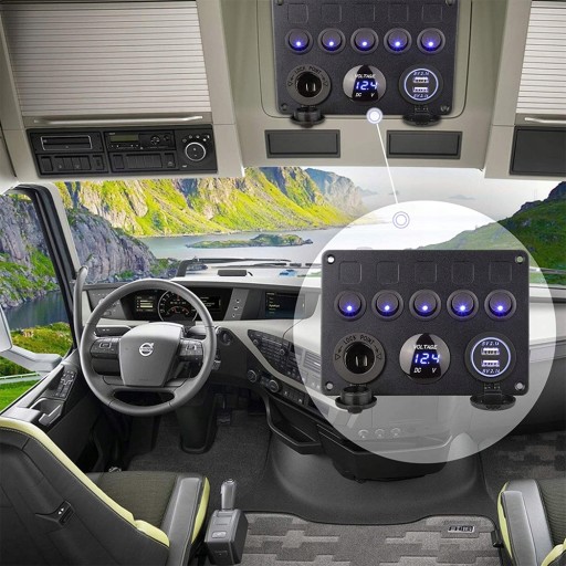 Wielofunkcyjny panel przełączników: 5-pozycyjny przełącznik do niebieskiej diody LED, gniazdo zapalniczki, podwójna ładowarka USB 2,1 A/5 V i cyfrowy woltomierz LED w zestawie.