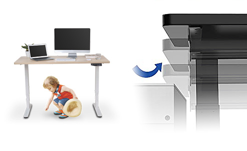 Regulowane biurko zostało wyposażone w system antykolizyjny, które zdecydowanie zwiększa bezpieczeństwo na stanowisku pracy. Innowacyjna technologia zapobiegająca kolizjom powoduje, że ergonomiczne biurko podczas zmiany wysokości cofnie się automatycznie, jeśli napotka przeszkodę na swojej drodze.