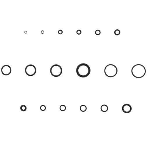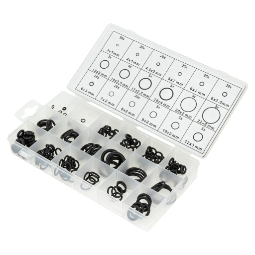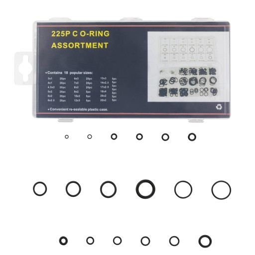 W zestawie znajduje się 225 szt. gumowych oringów w 18 popularnych rozmiarach. Zapakowane w plastikową walizeczkę posiadającą przegrody na każdy rozmiar osobno. Walizka zamykana jest na dwa mocne klipsy zabezpieczające przed wypadaniem, a także posiada uchwyt do zawieszenia jej.