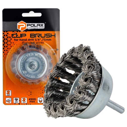 POLAX SZCZOTKA CZOŁOWA DO WIERTARKI Z TRZPIENIEM 1/4" DRUT PLECIONY 75MM