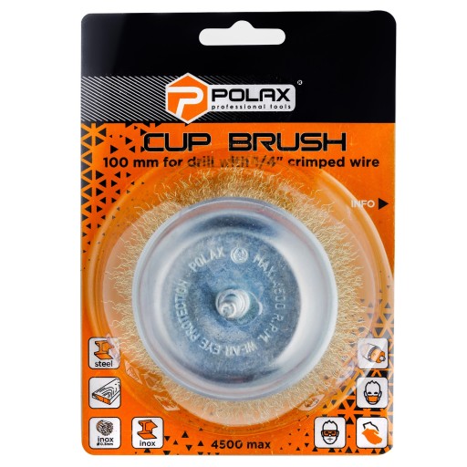 ПЕРЕДНЯЯ ЩЕТКА POLAX ДЛЯ СВЕРЛЫ С ХВОСТОВИКОМ 1/4", ГОФРИРОВАННАЯ ПРОВОЛОКА 100ММ