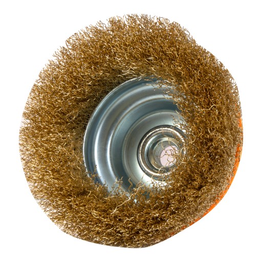 ✅ Szczotka ma kształt kubłowy z plastikową podstawą z rowkiem do gwintowanego połączenia ze szlifierką kątową.