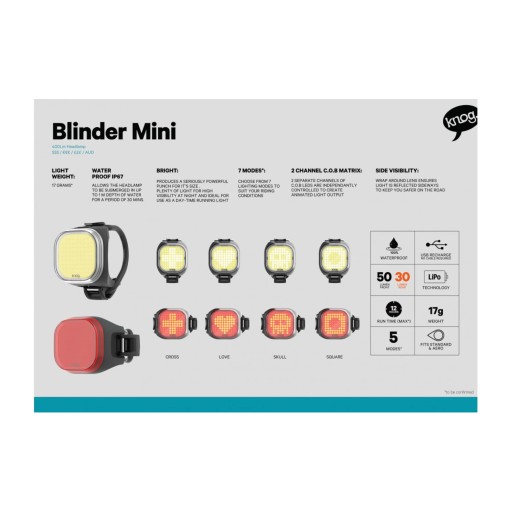 Knog Blinder Mini wykonana jest z lekkich, lecz wytrzymałych materiałów, waży zaledwie 17 gramów. Jej kompaktowe wymiary (40mm x 33mm x 31mm) oraz stylowy wygląd czynią ją dyskretnym, ale efektownym akcesorium każdego roweru. Ergonomiczny kształt ułatwia montaż i zapewnia idealne dopasowanie do różnych rodzajów kierownic. Dostępny wariant z wzorem czaszki dodatkowo podkreśla jej unikalny charakter.