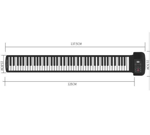 To pianino ręczne o smukłej konstrukcji jest łatwe do przenoszenia. Czarne klawisze są wyższe niż białe. Wewnętrzna folia przewodząca zapobiega elektryczności statycznej. Automatyczny wyłącznik zasilania. Z funkcjami sustain i wibracji.
