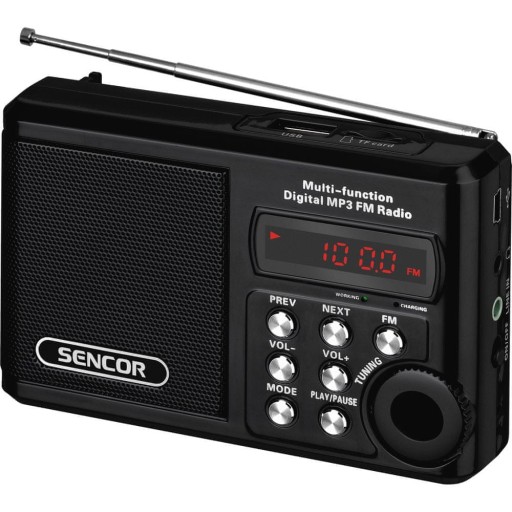 Kieszonkowy odbiornik radiowy. Analogowy odbiornik FM pokazujący częstotliwość na wyświetlaczu LED. Przyłącze USB. Slot na kartę micro SD (max 8GB).