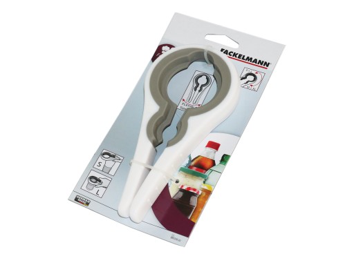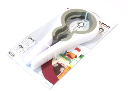 Uniwersalny otwieracz do słoików i bu-ek. Wykonany z tworzywa sztucznego. Wewnętrzna część z gumowym wykończeniem.