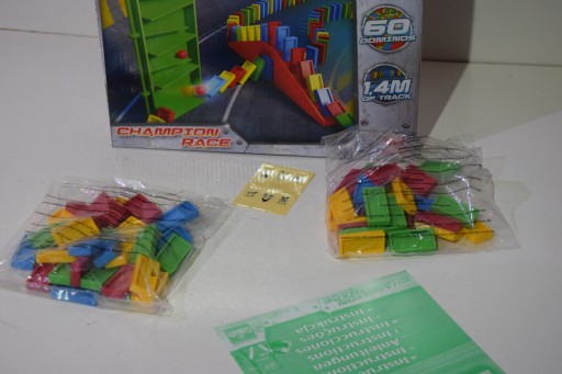 Goliath Domino Express Starter Lane Stwórz dłuższy tor z 60 dodatkowymi cegłami, labiryntem z diabelską kulą i falą, aby dodać dodatkowej objętości swojej konstrukcji! Domino jest pierwotnie grą polegającą na układaniu płytek, na których można zobaczyć od 1 do 6 kropek na połowę. Każda połowa ma swój własny „numer”. Ideą tej gry jest połączenie gier w taki sposób, aby liczby pasowały do siebie i tworzyły rząd. W przeszłości powstały różne wersje tej gry. Innym sposobem zabawy domino jest układanie ich pionowo, jedna za drugą. Jeśli jeden kamień się przewróci, powoduje to upadek następnego kamienia, który z kolei dotyka następnego i tak dalej. Nazywa się to efektem domina. Wcześniej odbył się także Dzień Domina, podczas którego drużyny rywalizowały o ustanowienie rekordu świata w liczbie przewróconych kostek domina na 1 torze. Często wokół tematu tego roku powstawały całe dzieła sztuki. 60 kostek dominaLabirynt z piłkąGolfOdpowiedni dla dzieci od 6 lat
