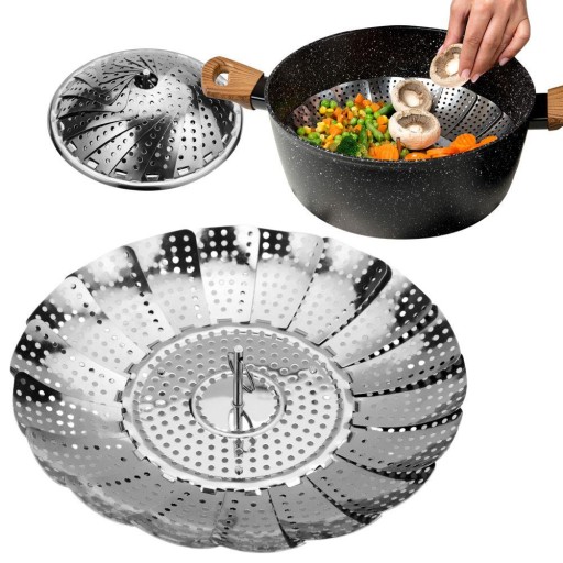 Rozkładany wkład do gotowania na parze, pozwoli na swobodne przygotowywanie zdrowych potraw. Odpowiedni do różnej wielkości garnków, dzięki regulowanej średnicy. Z jego pomocą przygotujemy ryby, warzywa, owoce morza oraz inne potrawy na parze. W szufladzie kuchennej zajmie niewiele miejsca. Wkład jest łatwy w obsłudze i przydatny w każdym domu. Dzięki niemu nie musisz kupować specjalnego naczynia, gdyż każdy garnek zamieni w doskonały parowar. Wykonany jest z materiałów bezpiecznych dla zdrowia i neutralnych dla żywności.