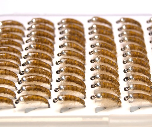 Nimfy na haczykach bezzadziorowych w rozmiarze #10, z wolframowymi główkami 3 mm.