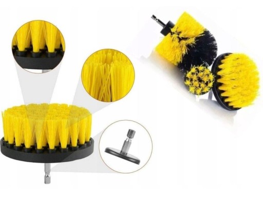 - Szczotka stożkowa (czarno-żółta, górna lewa): Stożkowy kształt pozwala na precyzyjne czyszczenie trudno dostępnych miejsc, takich jak kąty, szczeliny czy narożniki. Doskonale radzi sobie z uporczywymi zabrudzeniami na powierzchniach łazienkowych, felgach i innych nieregularnych kształtach.