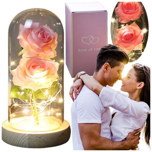 Różowa PODWÓJNA sztuczna róża, dwie różowe róże wyglądające jak prawdziwe w kopule szklanej, z oświetleniem LED.