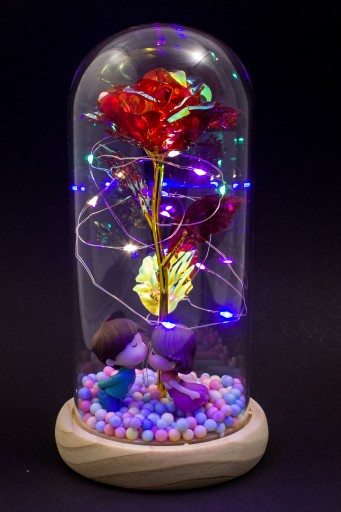 Czerwona, przechodząca w złotą sztuczna róża, z figurkami całującej się pary i kolorowymi kuleczkami w kopule szklanej, z kolorowym oświetleniem LED.