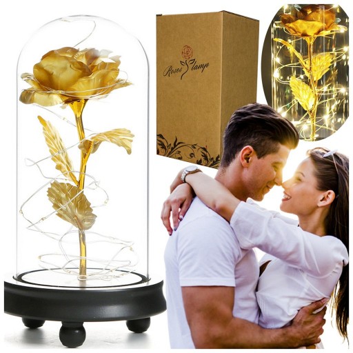 ZŁOTA SZTUCZNA WIECZNA RÓŻA W SZKLE OŚWIETLENIE PREZENT URODZINY DLA NIEJ