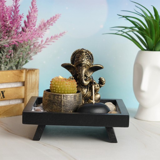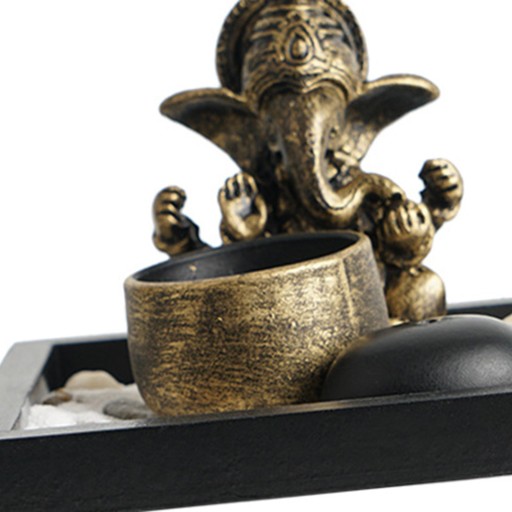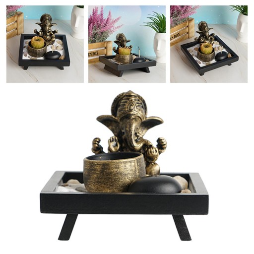 Zawiera posąg słonia, świecznik, uchwyt na patyki, ozdobne kamienie i tacę