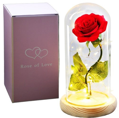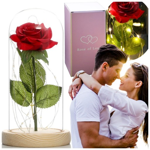 Ta precyzyjnie zrobiona róża, symbol miłości, została umieszczona w szklanej, pięknej kopule, przez którą widać cały czas jej piękno, nawet po ciemku, gdyż rozświetla ją 20 światełek LED , którymi jest oplatana.