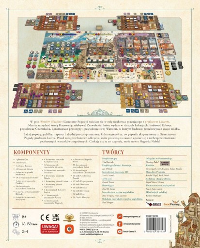 Weather Machine to zaawansowana graplanszowa zaprojektowana przez Vitala Lacerdę (On Mars, Kanban EV), w której gracze wcielają się w role naukowców starających się poprawić działanie generatora pogody stworzonego przez genialnego profesora Lativa. Generator miał za zadanie utrzymywanie idealnej pogody na świecie - farmy potrzebują czasami deszczu, a w kurortach powinno wiecznie świecić słońce. Jednak okazał się maszyną niedoskonałą - jego działanie zakłóca pogodę w innych miejscach na świecie. Celem naukowców jest prowadzenie eksperymentów i badań nad pogodą, publikowanie prac naukowych, dzięki którym uda się udoskonalić maszynę, a może nawet otrzymać za to Nagrodę Nobla. Podobnie jak w poprzednich grach duetu Vital Lacerda i Ian O'Toole, tak i tutaj zetkniecie się z artystycznym dziełem sztuki. Duża kolorowa plansza, kilkadziesiąt customowych meepli robotów, a do tego drewniane tokeny ksiąg, które zastąpiły zwykłe tekturowe żetony.