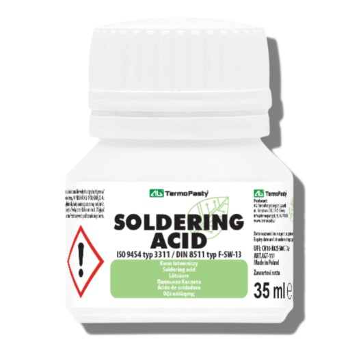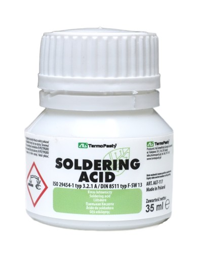 - Kwas lutowniczy to substancja, która znajduje zastosowanie podczas pracy przy niklowanych powierzchniach. Butelka zawiera płyn, z którego należy ostrożnie korzystać. Preparat powinno nakładać się w małych ilościach i stopniowo zmywać wodą. Składa się w 35% z silnego kwasu fosforowego. Jeśli choćby kropla kwasu lutowniczego AG Termopasty przedostanie się do oczu, należy czym prędzej przemyć je dużą ilością wody i wybrać się na wizytę do lekarza.