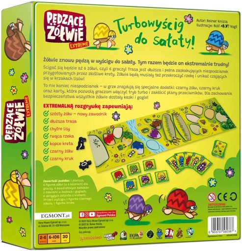 Pędzące żółwie ExtremeTurbowyścig do sałaty! Żółwie znowu pędzą w wyścigu do sałaty, ale tym razem będzie on ekstremalnie trudny. Ścigać się będzie aż 6 żółwi, czyli 6 graczy! Trasa jest dłuższa i pełna zaskakujących niespodzianek przygotowanych przez złośliwe krety. Żółwie będą musiały także przekroczyć rzekę i unikać czającego się w krzakach lisa! A to nie koniec niespodzianek - w grze znajdują się także specjalne dodatki: czarny żółw, czarny kruk oraz karty, które pozwolą graczom włączyć tryb turbo i zakłócić plany przeciwników. Jest to zatem wyścig pełen czyhających na graczy niebezpieczeństw i niesamowitych zwrotów akcji! W extremalnej wersji hitu Pędzące żółwie proponujemy znaną wszystkim grę z nowymi turbododatkami, które powodują, że szybkość jest naprawdę zawrotna. Wszystkie żółwie dostały kaski i gogle! Bezpieczeństwo naszych małych zawodników to podstawa!