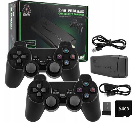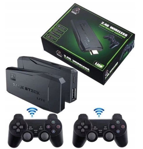 Dwa bezprzewodowe pady do gier, działające na sygnale 2,4 GHz, pozwalają na sterowanie konsolą bez użycia kabla.