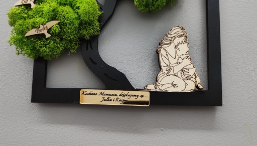 Bonsai - drzewko szczęścia jako prezent z okazji Dnia Mamy - 26 maja Drzewo ozdobione mchem chrobotkiem. W drzewko jest wkomponowana symboliczna postać mamy i dziecka. Dodatkowo rama ozdobiona jest piękną, niezwykła tabliczką zrobioną ze złotego lustra. Złote lustro nadaje elegancji i uroku. Grawer w tabliczce można dowolnie zmieniać.