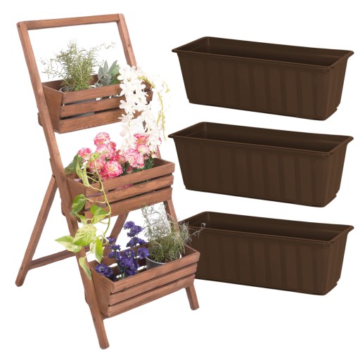 KWIETNIK STOJĄCY DREWNIANY BRĄZOWY KASKADOWY 3 RZĘDY Z TRZEMA WKŁADAMI