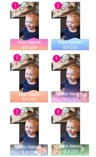 Przygotowaliśmy dla Państwa 18 wzorów różnorodnych ramek do zdjęć. Dodatkowo mogą Państwo umieścić swój napis przy zdjęciu. Takie personalizowane magnesy sprawią się idealnie jako podziękowanie dla gości będących na roczku, będą świetnym prezentem dla najbliższych.