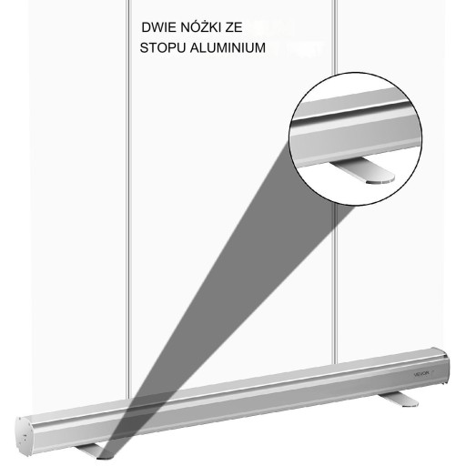 Stojak na baner wyposażony jest w dwie stopy podporowe ze stopu aluminium, które zwiększają stabilność urządzenia. Dzięki temu narzędzie utrzymuje odpowiedni dystans społeczny, co jest szczególnie ważne w przestrzeniach publicznych.