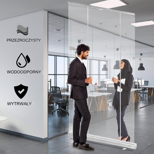 Stojak na baner wykonany z wysokiej jakości folii PET jest wodoodporny i wytrzymały, stanowiąc niezbędną, przezroczystą barierę zabezpieczającą.