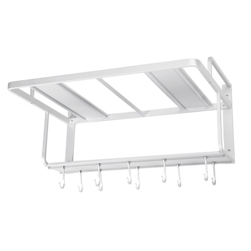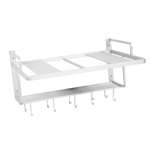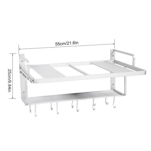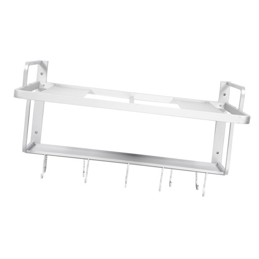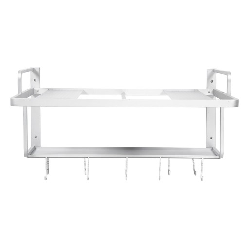 W stojaku do przechowywania zastosowano aluminium przestrzenne z anodowaną powierzchnią, odporne na korozję, antykorozyjne, mocne i trwałe. Konstrukcja dwuwarstwowa, górna warstwa może być używana do umieszczenia kuchenki mikrofalowej lub piekarnika, podczas gdy dolna warstwa doskonale nadaje się do przechowywania przypraw i ampułek. Haczyki wielofunkcyjne można wykorzystać do zawieszenia akcesoriów kuchennych, takich jak łyżka, sitko do oleju i inne drobne przybory kuchenne. Z boczną poręczą zabezpieczającą przed wypadaniem przedmiotów. Konstrukcja ścienna zajmująca mało miejsca, odpowiednia do montażu w kuchni i jadalni.