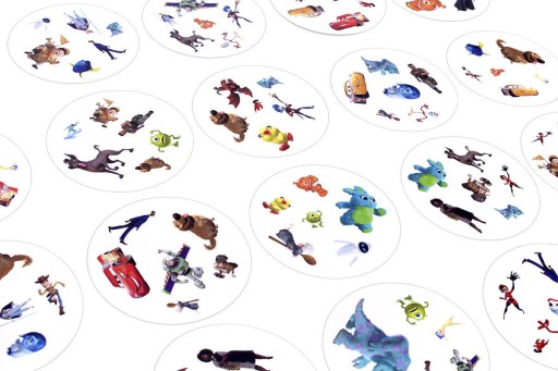 Aby utrudnić zabawę symbole na kartach bywają odwrócone i miewają różne rozmiary. Same karty są okrągłe i kolorowe, a każda z nich ma unikalny zestaw symboli związanych ze światem bajek Pixara.