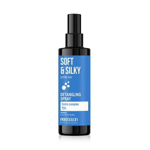 Prosalon Soft & Silky Detangling to profesjonalny produkt do codziennego rozczesywania, przeznaczony szczególnie do włosów przesuszonych i kruchych. Formuła zawiera nowatorski hydro complex 72h, który zapewnia natychmiastowe i głębokie nawilżenie. Zmiękcza, wygładza, zapobiega splątywaniu kosmyków.