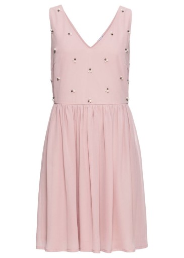 Bardzo kobieca sukienka , z aplikacją z perełek w górnej części.