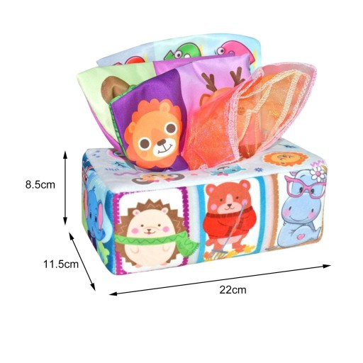 Pudełko na chusteczki dla niemowląt: To sensoryczne pudełko na chusteczki to zabawka Montessori, która zapewni dziecku wielogodzinną zabawę swoimi kolorami, szeleszczącymi dźwiękami i dobrą zabawą.
