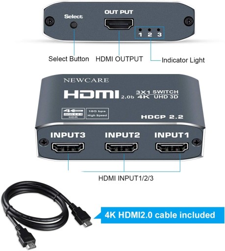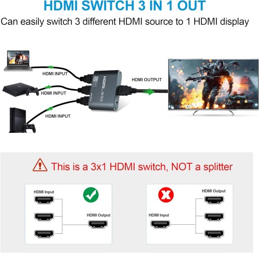 Przełącznik HDMI 4K 60 Hz: avedio łączy Przełącznik HDMI 3 porty umożliwiają przełączanie obrazu i dźwięku z trzech różnych źródeł wejścia HDMI (TV Box, X box, Roku itp.) na jeden wyświetlacz HDMI (telewizor, monitor, projektor itp.) przycisk ręcznego przełączania na górze przełącznika wyboru HDMI, umożliwia łatwe przełączanie pomiędzy 3 źródłami HDMI bez podłączania i odłączania, co może chronić wszystkie urządzenia.