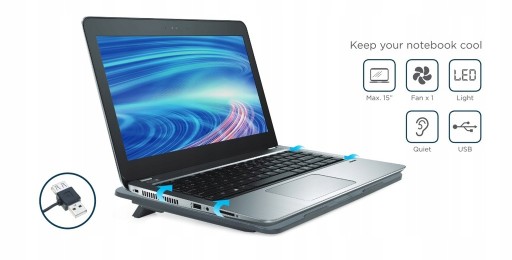 Wentylatory w podstawce chłodzącej są zasilane za pomocą standardowego złącza USB-A, które znajduje się w każdym laptopie. Dodatkowo podkładka nie wymaga, żadnych dodatkowych sterowników, dzięki czemu możesz po prostu podłączyć podkładkę pod swój notebook i cieszyć się z funkcji chłodzenia od razu.