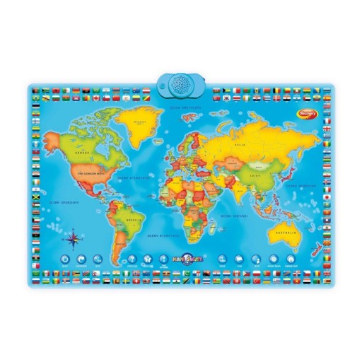 Mapę można zawiesić na ścianie lub położyć na podłodze. Dzieci postępując zgodnie z instrukcją odkryją każde państwo na interaktywnej mapie. Quiz, Super Quiz i gra Wyzwanie dla 2 graczy umożliwi dziecku sprawdzenie wiedzy. Dzieci zostaną nagrodzone odgłosami za poprawne odpowiedzi. Jeżeli odpowiedź jest nieprawidłowa zabawka poda prawidłową.