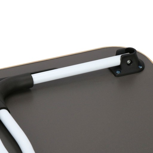 Blat umieszczony na składanych metalowych nóżkach, dzięki którym szybko i łatwo się składa a dodatkowo zajmuje niewiele miejsca, dlatego bez problemu można go schować. Ranty nóżek zostały zabezpieczone miękką pianką, która działa antypoślizgowo i zapobiega przed rysowaniem się powierzchni, na której zostanie umieszczony stolik.