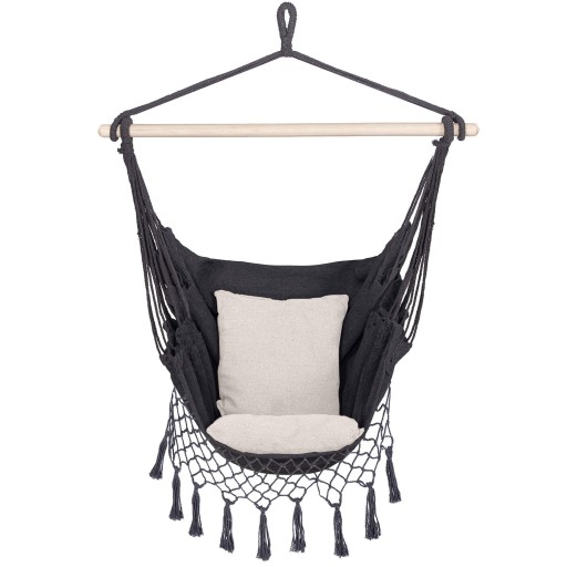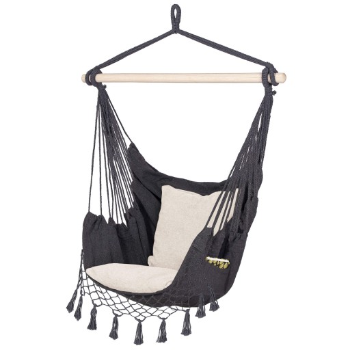 W zestawie z krzesłem bujanym w stylu hamakowym znajdują się GRATIS dwie poduszki dopasowane kolorystycznie do siedziska. Dopełnieniem wyglądu tego niezwykłego fotela wiszącego są frędzle, które są hitem ostatnich czasów w dekoracji wnętrz.