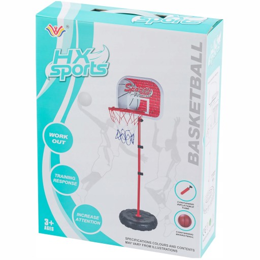 Cała konstrukcja zestawu składa się z tarczy z koszem, 4 rurek które stoją na czarnej, dużej podstawie o średnicy 26cm, do której można nalać wody lub wsypać piasku. Wysokość stojaka jest regulowana od 39 cm aż do 170 cm. Dzięki temu całość jest stabilna i dziecko może grać na podwórku, w domu lub w innym dowolnym miejscu.