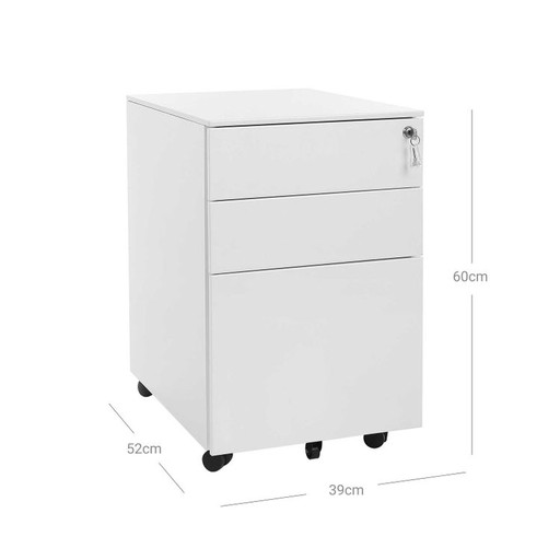 - Zamykany pojemnik na kółkach: Za pomocą zamka można bezpiecznie zamknąć wszystkie 3 szuflady. Kółka obracają się o 360 stopni i przetaczają szafkę w dowolne miejsce. Dzięki swoim rozmiarom mieści się również pod biurkiem