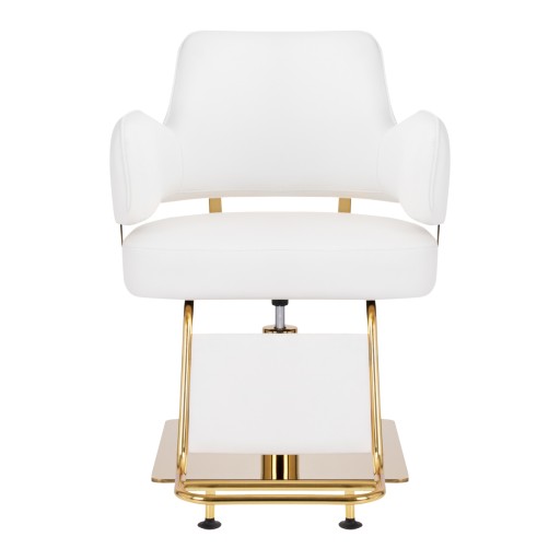 Nowoczesny fotel fryzjerski z podnużkiem o wyjątkowym designie. Bardzo wygodny, idealnie pasujący do nowoczesnych salonów. Specjalnie wyprofilowany, by zapewnic klientowi wygodną pozycję podczas zabiegu. Regulowany w płaszczyźnie pionowej. Bardzo stabilny i solidny. Obicie z wysokiej jakości ekoskóry. Kolor biały ze złotymi elementami.