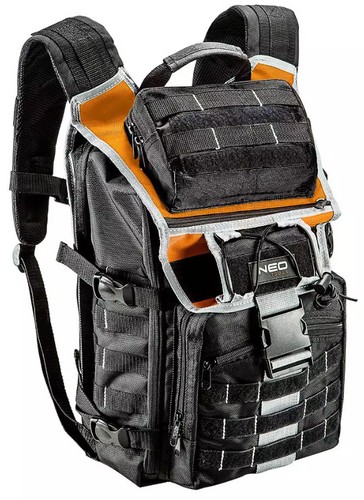 Plecak monterski NEO (nr ref. 84-304) wykonany z trwałego poliestru 600 D, gwarantującego długoletnią trwałość torby. Plecak wyposażony jest w 4 zewnętrzne i 18 wewnętrznych kieszeni na narzędzia ułatwiających przechowywanie i transport. Dla komfortu plecak posiada profilowane pasy nośne wraz z pasem piersiowym oraz oddychającymi plecami. Marka NEO spełnia oczekiwania profesjonalistów.