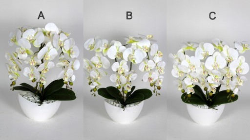 Kompozycja wykonana w plastikowej, połyskującej donicy. Model składa się z trzech silikonowych pędów storczyków oraz gumowanych liści wraz z korzeniami.