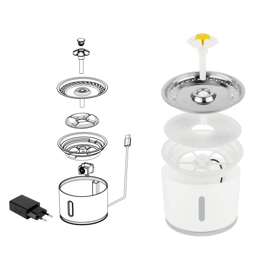 Fontanna dla kota jest dobrze skonstruowana i i można ją szybko zmontować i zdemontować, można regularnie czyścić pompę wodną i korpus fontanny do picia.
