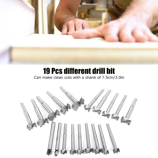 3. 19 szt. różnych wierteł, umożliwiających wykonywanie czystych cięć z trzpieniem o średnicy 7,5 cm/3,0 cala. Twoje 19 wierteł można łatwo przechowywać między zadaniami.