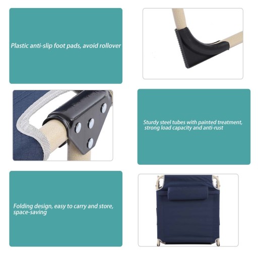 Salon można złożyć do niewielkich rozmiarów, co ułatwia jego przenoszenie i przechowywanie. Wysokiej jakości materiał jest wytrzymały, oddychający i odporny na ścieranie, dzięki czemu zapewnia wyjątkowy komfort podczas relaksu. W ramie zastosowano stalowe rury o dużej nośności, a plastikowe antypoślizgowe nakładki na stopy zapewniają dodatkową stabilność. Regulowane oparcie umożliwia ustawienie najwygodniejszego kąta, regulacja w 4 pozycjach, umożliwia całkowite złożenie łóżka na płasko. Z wyjmowaną poduszką, która pozwala złagodzić nacisk szyi.