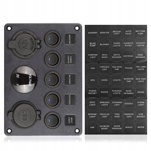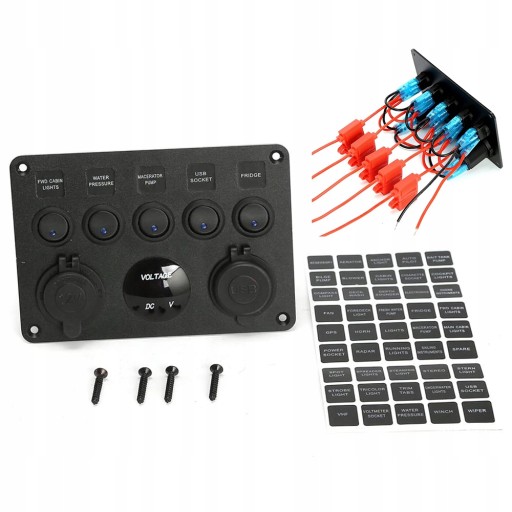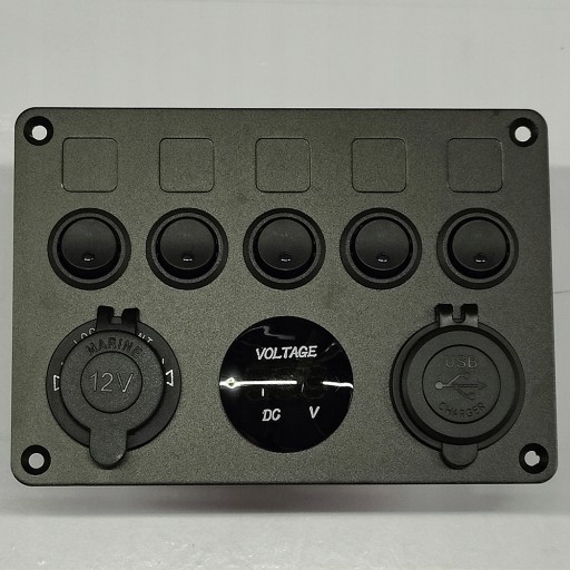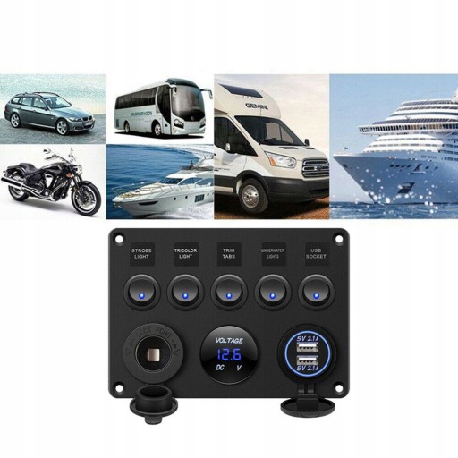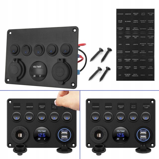 - Wielofunkcyjna tablica rozdzielcza - 5 włączników dźwigienkowych z niebieskimi diodami LED, gniazdo zapalniczki samochodowej, zasilacz 2,1 A / 5 V Dual USB i cyfrowy woltomierz LED.