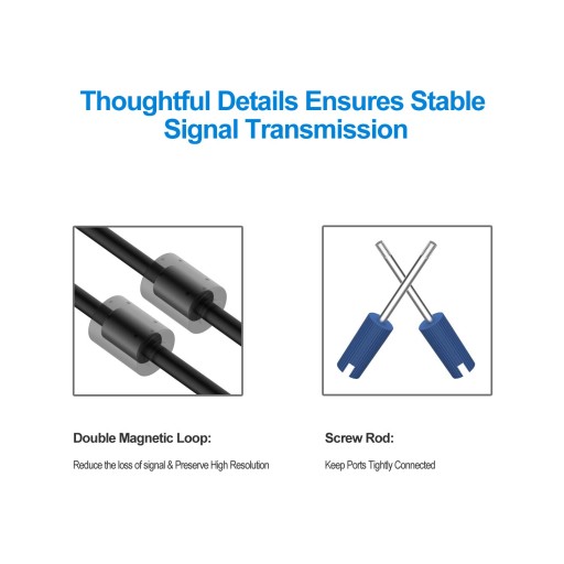 - Przewód VGA został zaprojektowany z formowanymi złączami odciążenia dla trwałości, uchwyty do łatwego podłączania i odłączania oraz śruby dokręcane palcami dla bezpiecznego połączenia