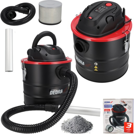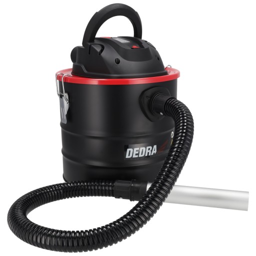 Odkurzacz kominkowy DEDRA, moc silnika 1200 W bezworkowy, pojemność zbiornika 18 litrów, maksymalne podciśnienie 17 kPa. Filtr HEPA zmywalny z metalowym oplotem, funkcja otrząsania filtra.